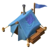 - Zu Beginn ist das Wohngebäude ein blaues Zelt mit einer Flagge.