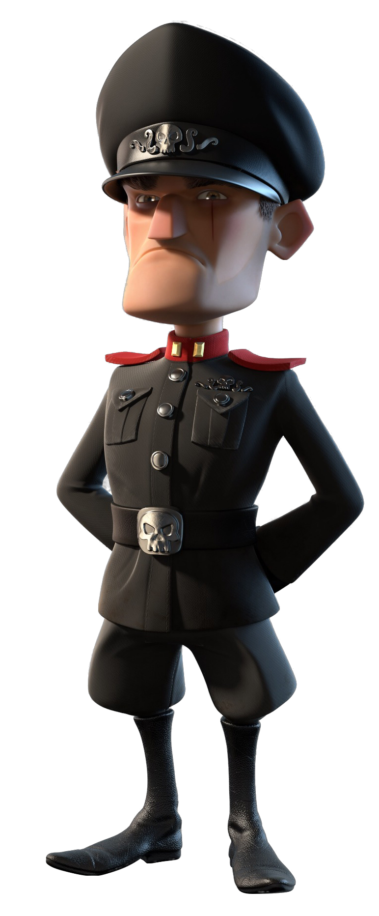 Il porte un uniforme noir avec du rouge au niveau du cou et des épaules.