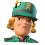 Sergent Brick est une femme aux cheveux blonds habillée avec des vêtements verts et un chapeau orné de l'insigne de sergent et d'une fleur.